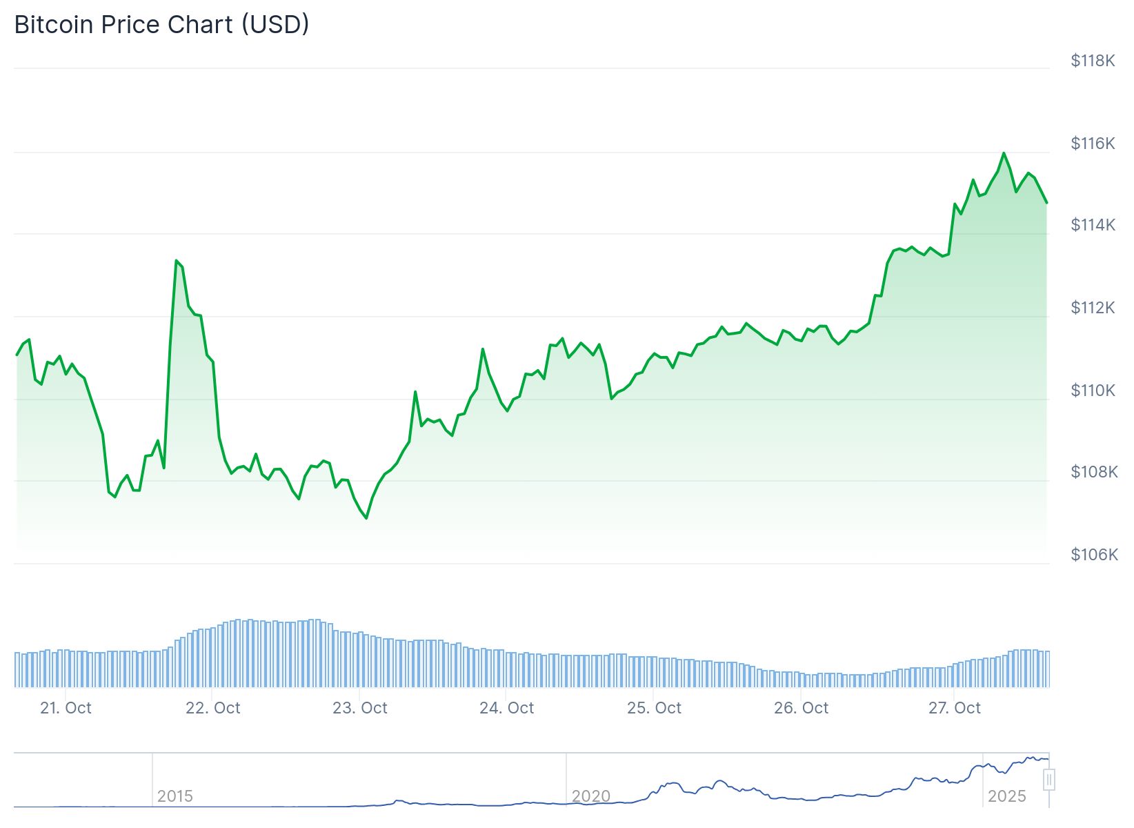 Le cours a touché un point bas à 104 000 dollars, pour remonter lundi, où la cryptomonnaie a de nouveau atteint le seuil de 116 000 dollars, un niveau non atteint depuis vendredi 13 octobre.