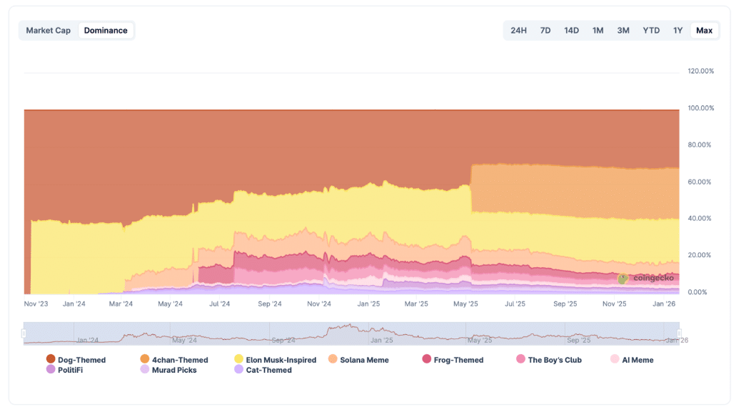 Le monde de la crypto a toujours eu un penchant viscéral pour les canidés. C’est précisément pourquoi le sous-secteur thématique du chien pèse actuellement 28 milliards de dollars de capitalisation boursière, représentant une domination de 31,66 % de l’ensemble du marché des meme coins.