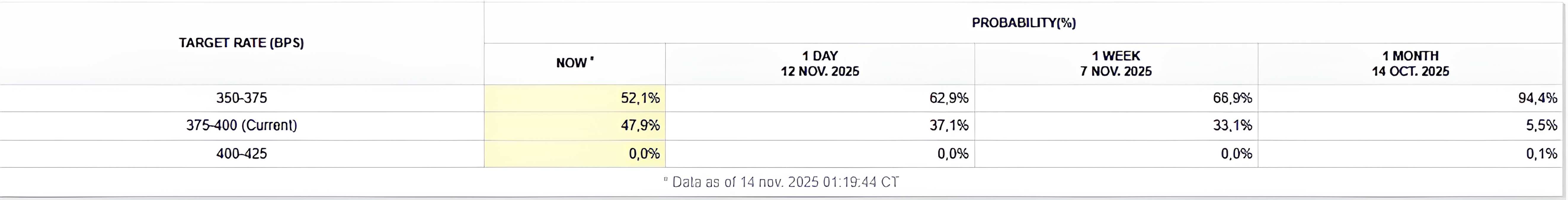 La chute ne vient pas seulement des cryptos. Elle reflète aussi un climat économique tendu. Les marchés doutent à nouveau d’une baisse des taux de la Fed en décembre. La probabilité de CME Group FED Watch est passée de 69 % à près de 52 % en quelques jours. Ce recul change la donne pour les investisseurs. Beaucoup réduisent leur risque en attendant plus de visibilité.