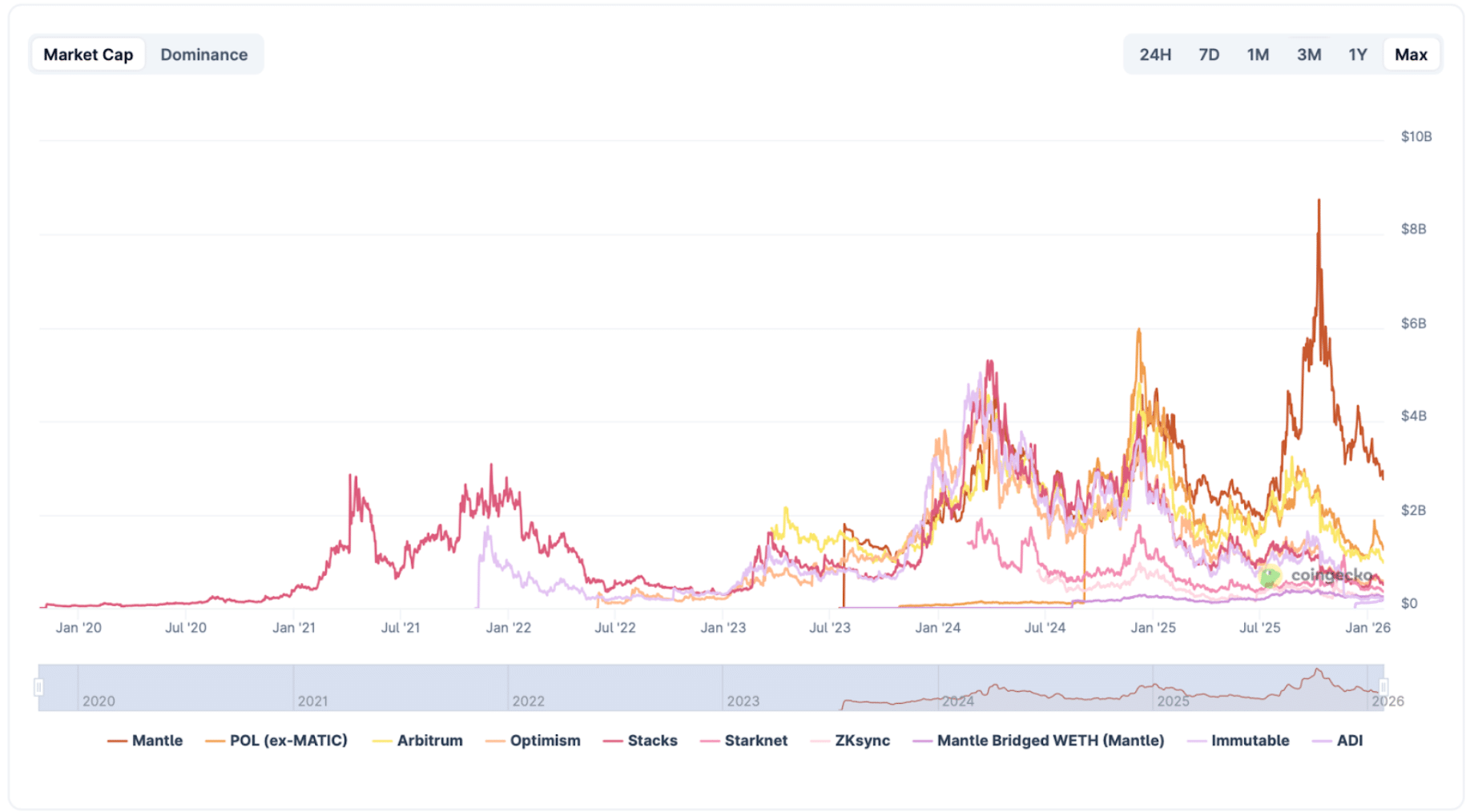 Cependant, le succès à long terme de ce modèle dépend de la croissance de la couche applicative. Nous avons déjà vu cela se produire dans l’écosystème Ethereum, où les principales couches 2 comme Mantle (MNT) et Polygon (POL) ont capturé un total combiné de 4 milliards de dollars en valeur totale verrouillée (TVL) en déchargeant le réseau principal.