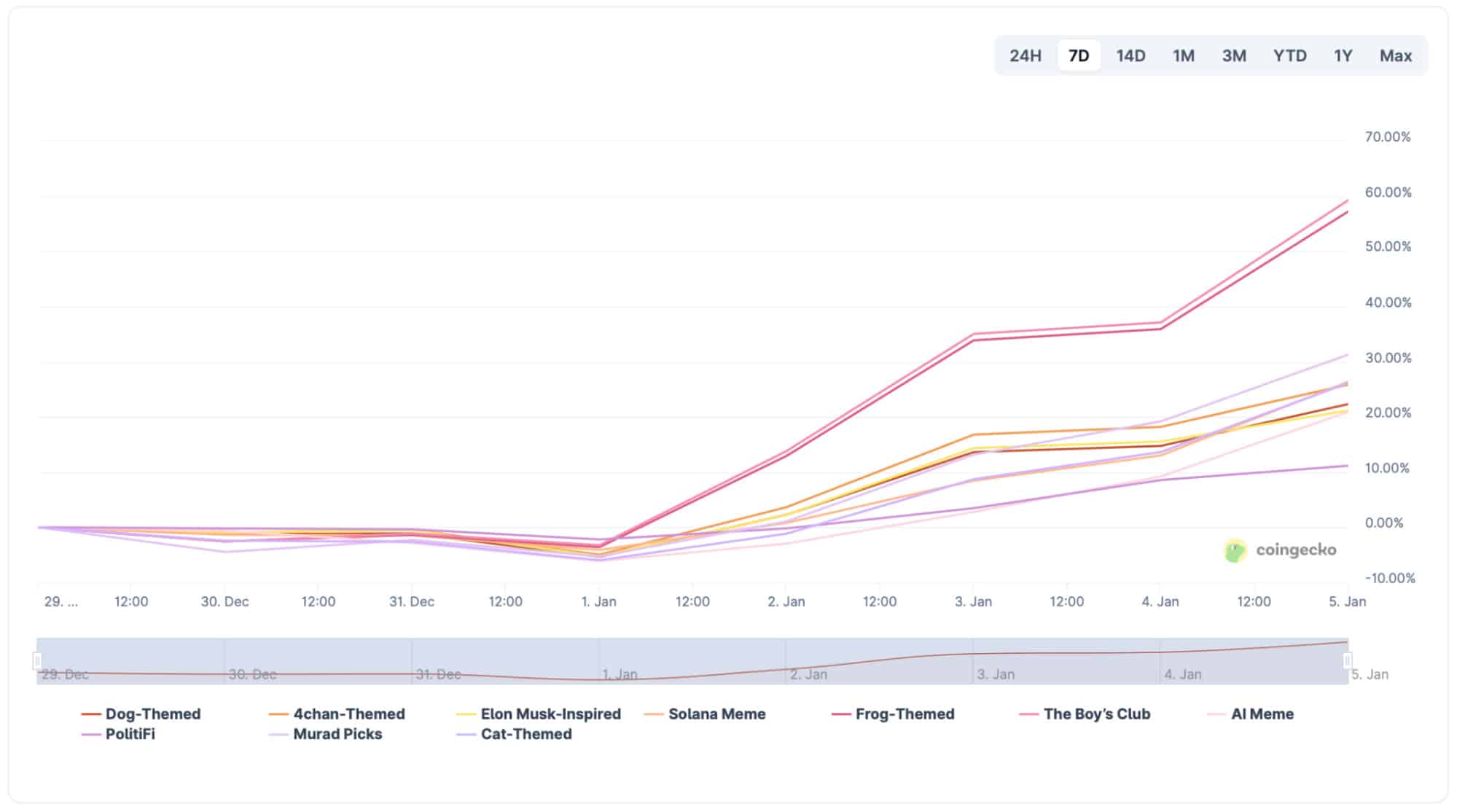 Cette confiance renouvelée est particulièrement visible dans les secteurs à haut risque. La capitalisation boursière des meme coins a récemment franchi le seuil des 51 milliards de dollars, une reprise significative par rapport à son creux précédent de 35 milliards. Alors que les jetons sur le thème du chien ont mené la charge globale, la performance individuelle de certains actifs est encore plus impressionnante.