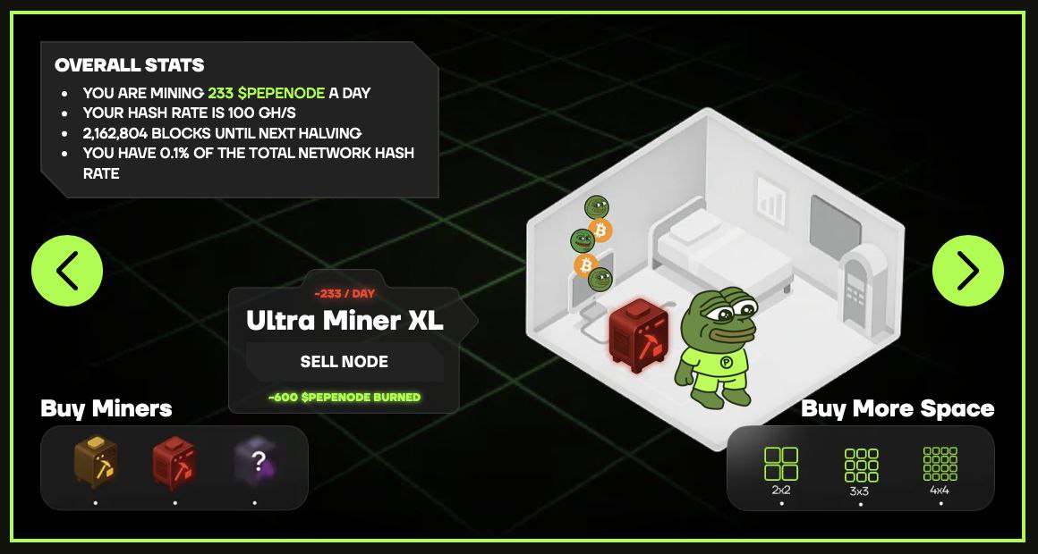 La première étape consiste à acquérir des PEPENODE, disponibles uniquement durant la prévente. Dans le jeu, ces tokens deviennent la monnaie centrale. Ils servent à acheter des nœuds miniers et à amplifier son infrastructure.