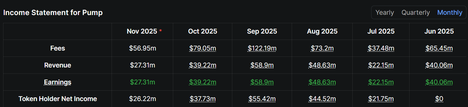 Le plus frappant, c’est la chute des revenus du site. Pump.fun est passé d’environ 58,9 M$ en septembre à 27,3 M$ en novembre. La baisse dépasse les 50 %, et cela montre bien que le flux de nouveaux projets faiblit. La machine tourne encore, mais elle tourne moins vite.