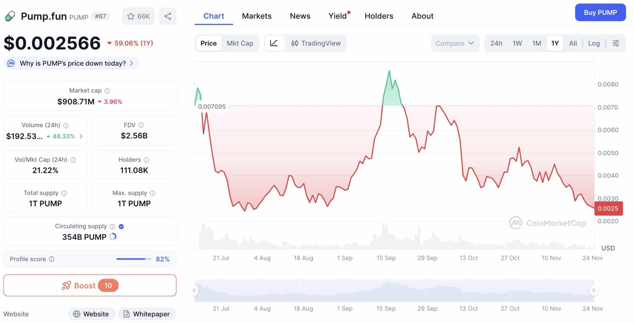 Dans ce climat tendu, même le token PUMP ne s’en sort pas. Il recule de plus de 20 % sur une semaine et passe sous 0,003 $. Il évolue donc sous le prix de la vente privée. Ce n’est jamais un bon signal. Beaucoup d’investisseurs commencent à se demander si la dynamique de Pump.fun n’est pas en train de s’éroder.