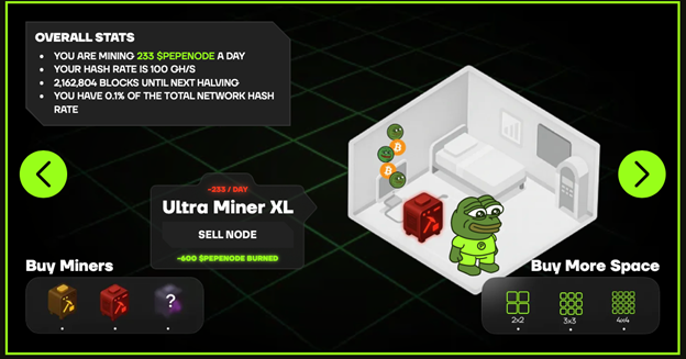 PepeNode repose sur ce même principe d’accessibilité. Il le pousse plus loin avec son jeu de minage virtuel. Plus votre configuration est optimisée, plus vos chances d’obtenir des tokens comme PEPE, FARTCOIN et d’autres meme coins performants augmentent.