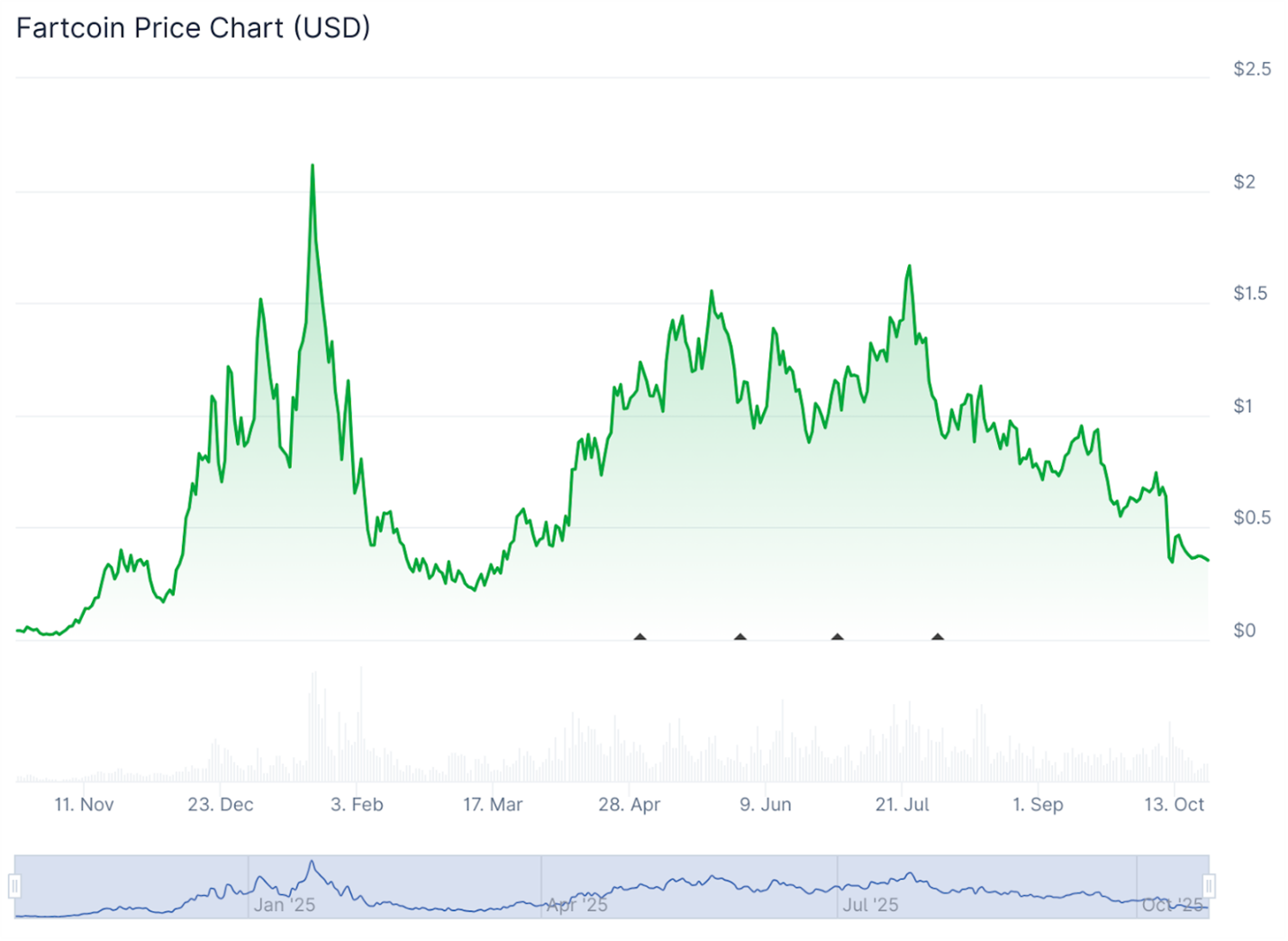 Depuis octobre dernier, FARTCOIN a bondi de 1 704 % depuis son point bas. Les détenteurs profitent encore d’un rendement d’environ 17x. Ceux qui ont vendu près du sommet de janvier ont réalisé un gain de 12 285 %, soit un incroyable 123,85x sur leur mise.