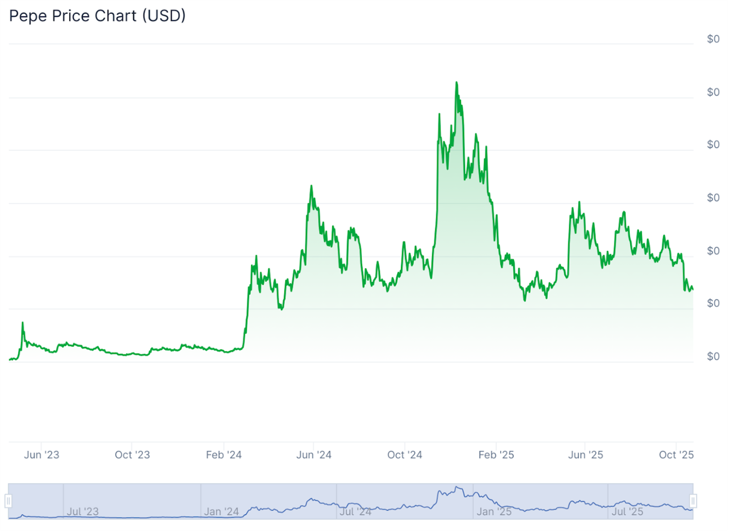 PEPE impressionne encore plus. Depuis son creux de février 2023, le token affiche une hausse de 12 518 %, soit un rendement de 125x. Ceux qui ont vendu près du sommet de décembre 2023 ont sécurisé des gains d’environ 50 762 %, soit un incroyable 508,6x depuis le point bas.