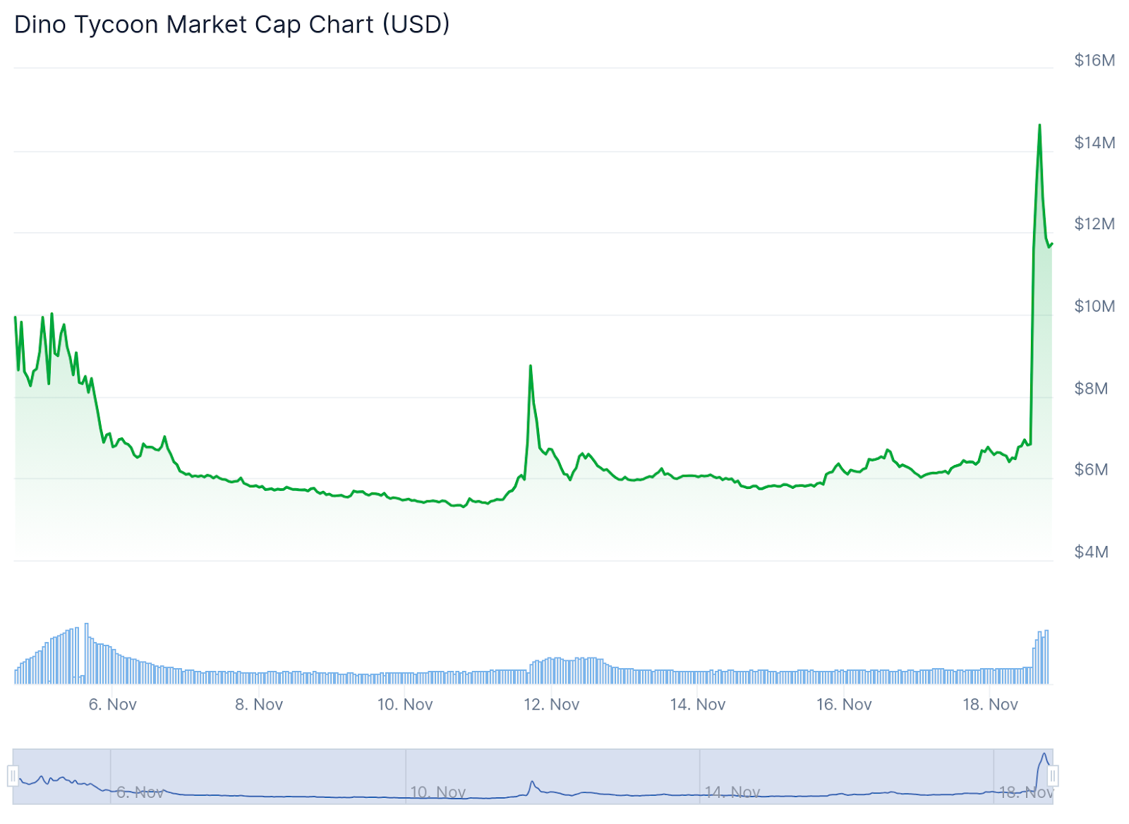 Dino Tycoon a tenu son TGE le 4 novembre. Depuis, le projet affiche une progression constante, marquée par une montée de 23 %. Mais l’envolée nocturne de 123 % modifie l’échelle de valeur.