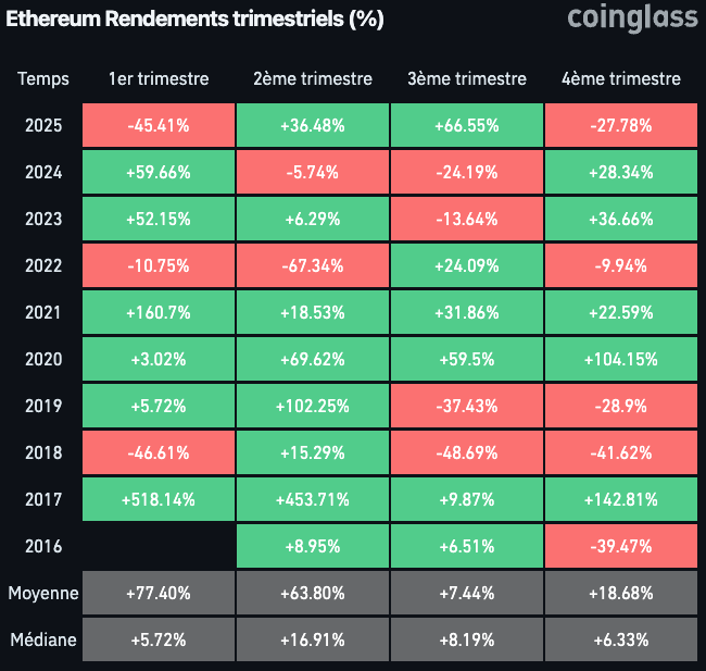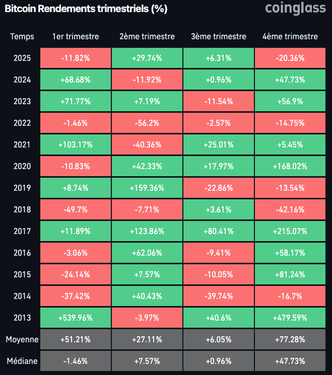 Le tableau trimestriel affiche un 4ᵉ trimestre 2025 en baisse d’environ 27,8 %, après un 3ᵉ trimestre très haussier (+66,55 %).