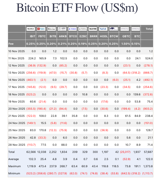 Les données sur les ETF Bitcoin spot indiquent 3,48 milliards de dollars de sorties nettes en novembre, soit le deuxième pire mois après février 2025 (3,56 milliards de dollars).