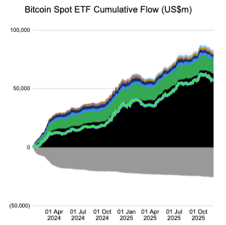 Les graphiques cumulés des ETF montrent encore près de 58 milliards de dollars d’entrées nettes depuis le lancement, malgré les retraits récents.