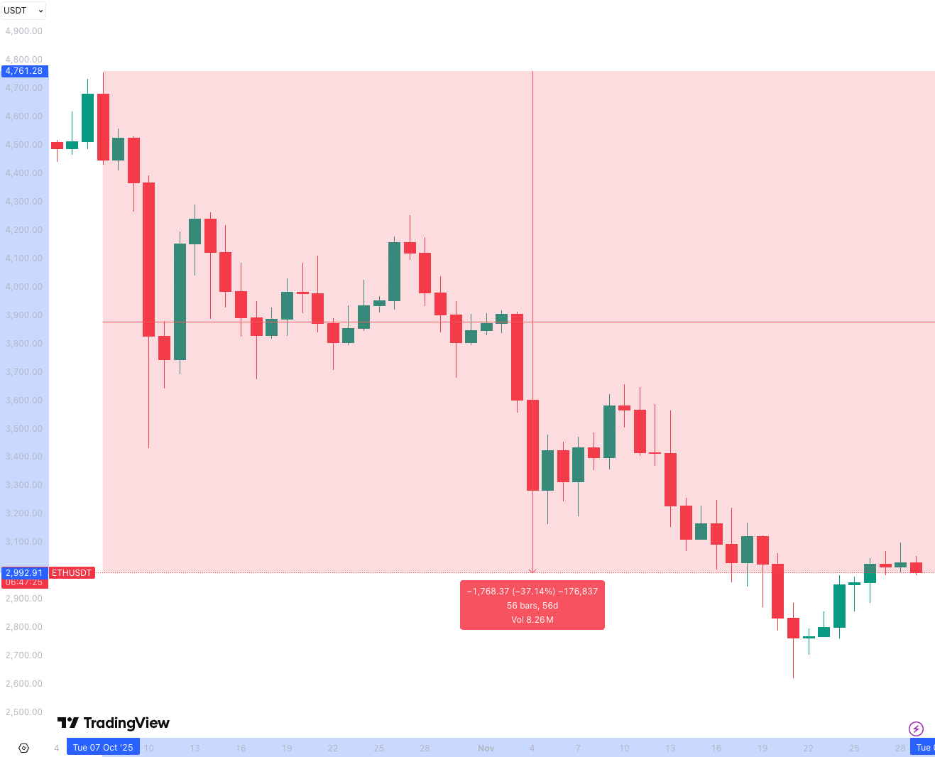 Au niveau des prix, ETH est passé d’une zone au-dessus de 4 200 à 4 800 dollars début octobre à des niveaux proches, voire légèrement sous les 3 000 dollars en novembre.