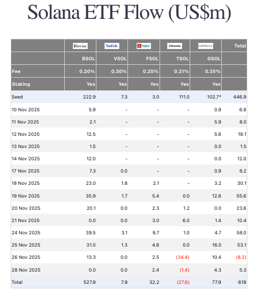 Néanmoins, on voit que le 26 novembre, les ETF Solana ont connu un premier jour de sorties nettes d’environ 8,2 millions de dollars.
