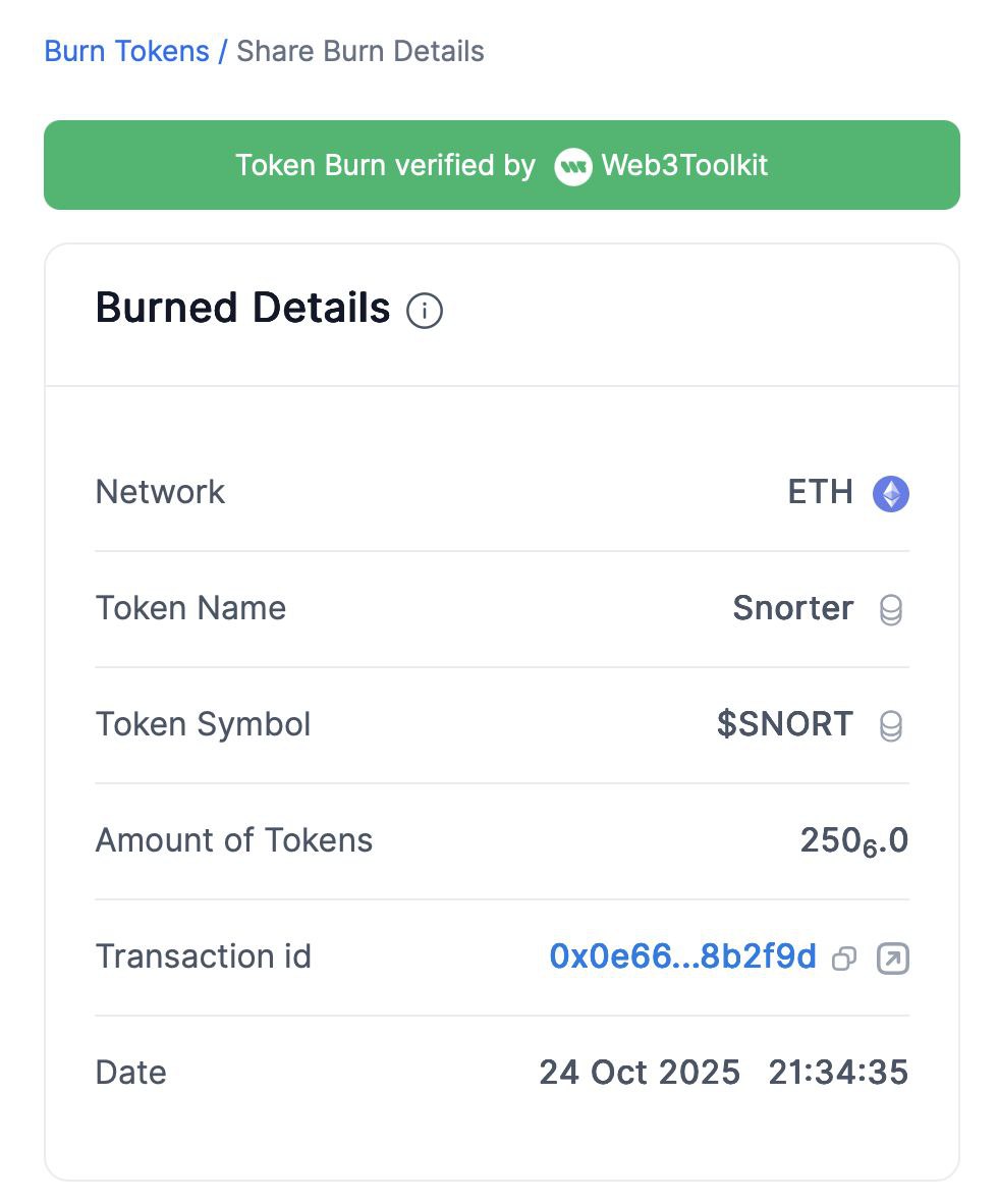 Le 24 octobre, Snorter Bot a allumé la mèche avec un burn de 250 millions de tokens. L’opération a effacé définitivement la moitié de l’offre totale de la blockchain. De 500 millions, le supply est passé à 250 millions. SNORT est devenu instantanément deux fois plus rare. Pour de nombreux observateurs, le token gagne aussi deux fois plus d’intérêt.