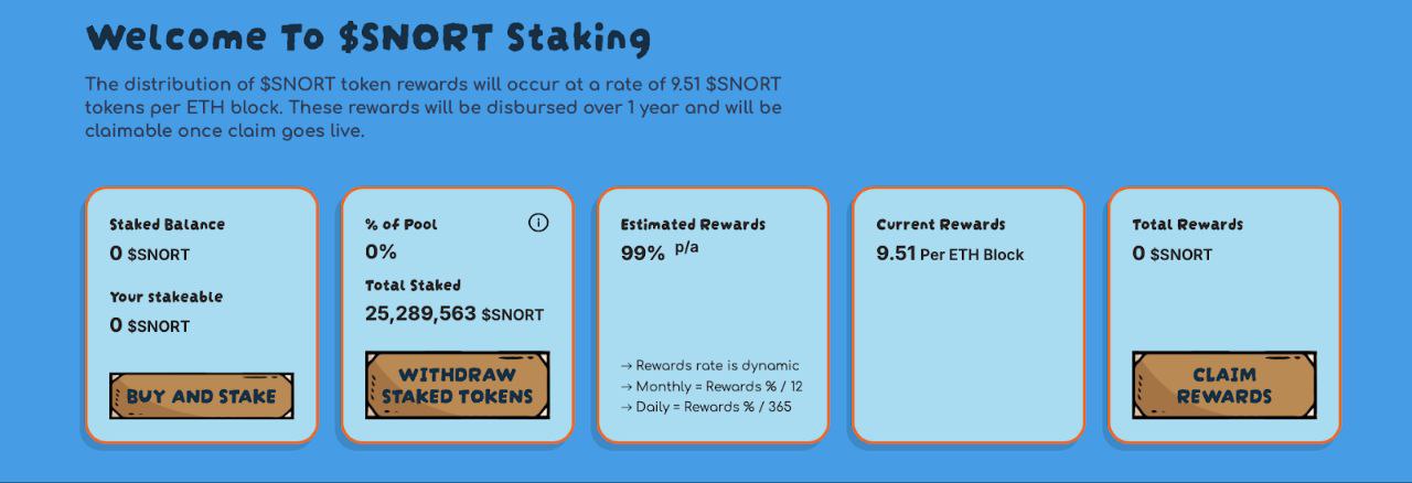 Les tokens SNORT peuvent également être mis en staking. Le protocole natif offre actuellement un APY dynamique de 99 %. Une opportunité attractive pour les détenteurs long terme.