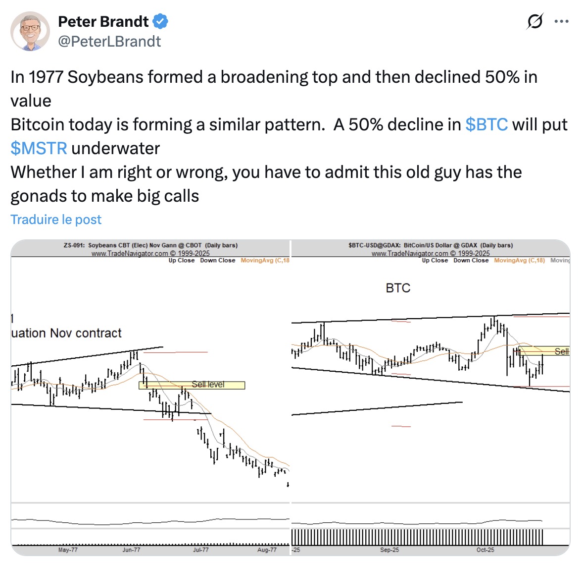 Cette vision heurte toutefois d’autres vétérans du marché. Le trader Peter Brandt, par exemple, alerte sur le fait que si le graphique du Bitcoin suit un scénario de bulle similaire à celui du soja dans les années 1970, Strategy pourrait se retrouver longtemps sous l’eau.