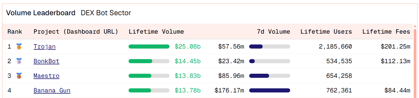 Cependant, le marché reste hautement concurrentiel. Des acteurs comme Banana Gun, Maestro et Trojan dominent déjà le secteur, avec un volume d’échanges combiné de plus de 319 millions de dollars sur sept jours.