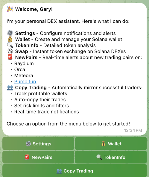 Il vous suffit d’ouvrir le bot et de suivre les directives du guide d’assistance intégré pour débuter. L’utilisateur a également la possibilité de cliquer sur des boutons interactifs tels que « snipe » ou « copy trade ». Le bot l’assiste progressivement pour établir sa stratégie et initier ses transactions.