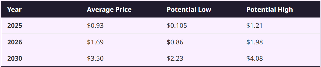 Actuellement, le jeton s’échange à 0,1073 $, un niveau qui laisse entrevoir une hausse potentielle de 766 %, soit un rendement d’environ 8,7 fois, même dans le scénario le plus prudent.