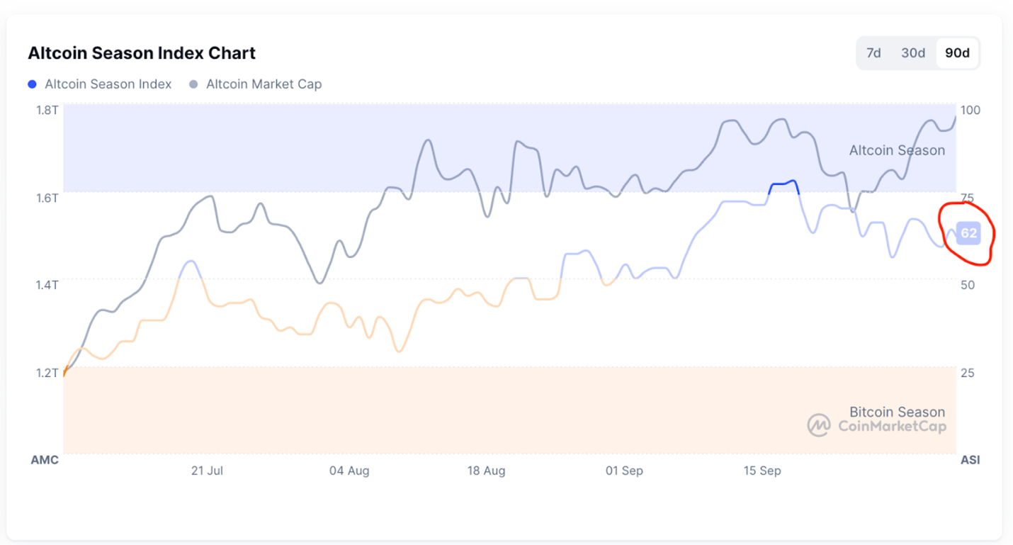 En effet, la saison des altcoins est sur le point de décoller. Wall Street Pepe est bien placé pour en tirer profit. L’indice Altcoin Season de CMC affiche 62. La saison des altcoins est officielle au-dessus de 75. Ce seuil indique que 75% des altcoins surperforment le Bitcoin sur une période glissante de 90 jours.