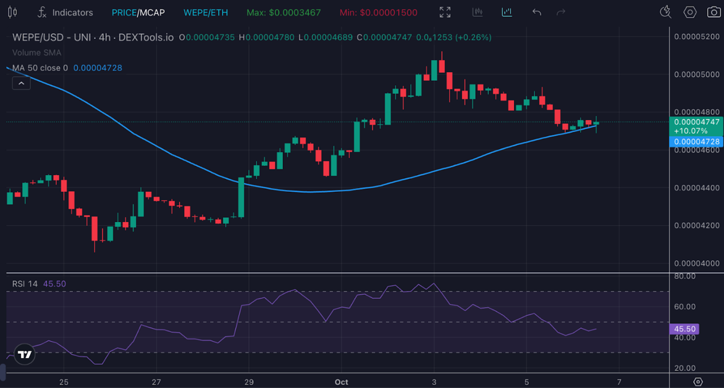 WEPE, qui compte près de 60 000 abonnés sur X, voit ses indicateurs techniques coïncider avec l’actualité haussière du jour. Sur le graphique de 4 heures, le prix trouve un soutien sur l’indicateur de moyenne mobile sur 50 jours (ligne bleue sur le graphique ci-dessous).