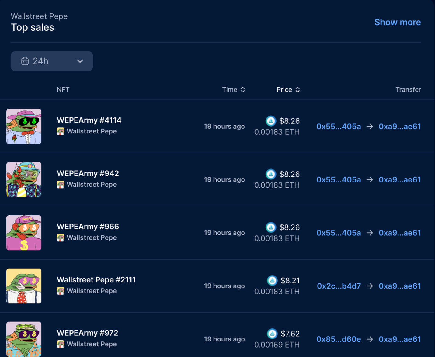 Le prix des NFT WEPE est en hausse (passant de 7,62 $ à 8,26 $) au cours des 24 dernières heures sur le marché secondaire, selon les données compilées par dappradar.
