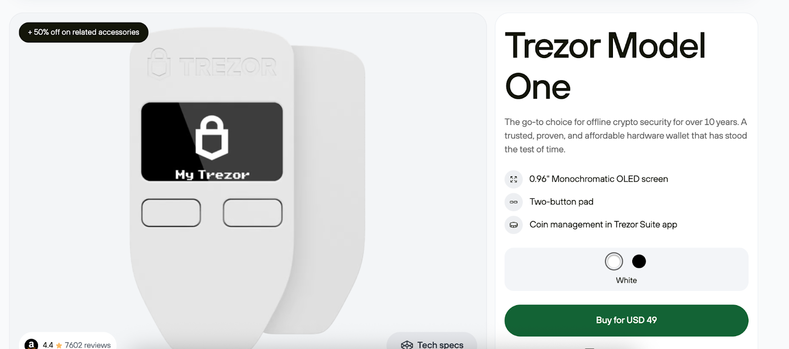 The Trezor Model One, priced at $49, is the original hardware wallet from SatoshiLabs (2014), a leading hardware wallet firm that has secured millions of users’ crypto for over a decade. Despite its budget-friendly price, it offers enterprise-grade security with fully open-source firmware.