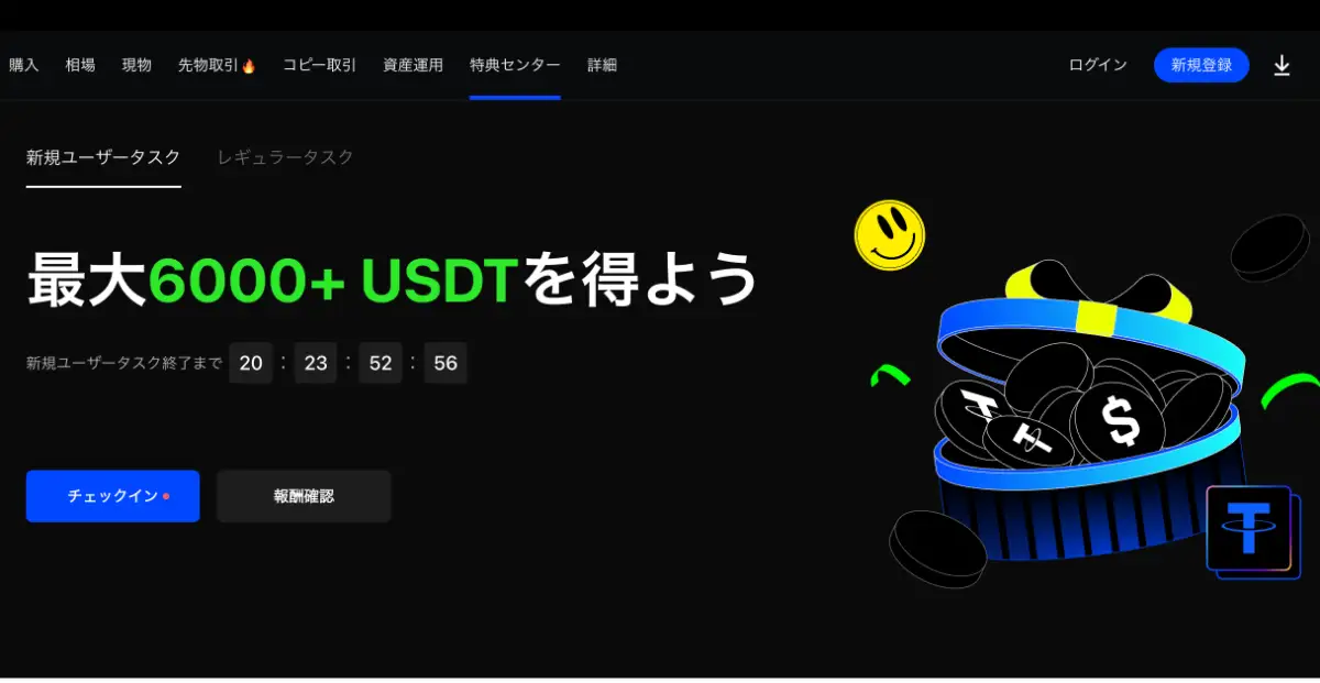 新規登録者はもちろん、すでに取引を行っているユーザーも対象となる今回のキャンペーンは、最大で 6000USDT(約90万円相当) を受け取れるチャンス。