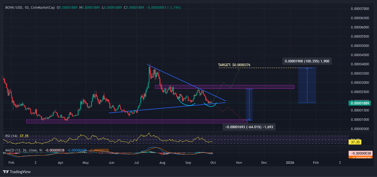 봉크 코인은 대칭 삼각형, 쌍바닥 패턴, 그리고 과매도 지표가 겹치면서 상승 전환 가능성을 보이고 있다.