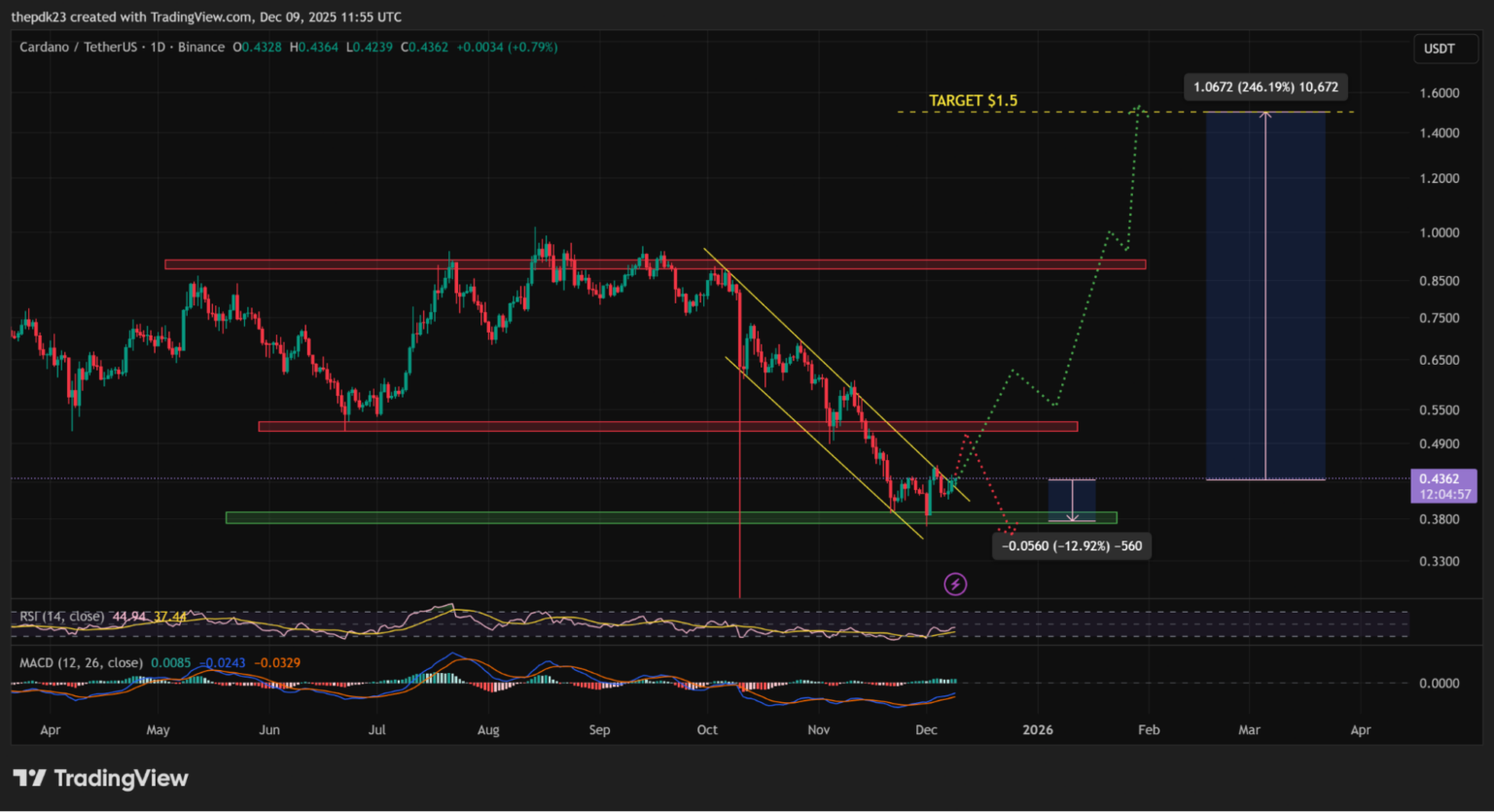 카르다노(ADA) 차트에 따르면, 에이다는 수개월 동안 하락 추세 채널을 이어왔다. 최근에는 하락 추세 채널을 돌파하려는 움직임을 보이고 있다. 카르다노 코인은 0.38~0.40달러(약 558~588원) 부근의 주요 수요 구간에서 반등하고 있다.