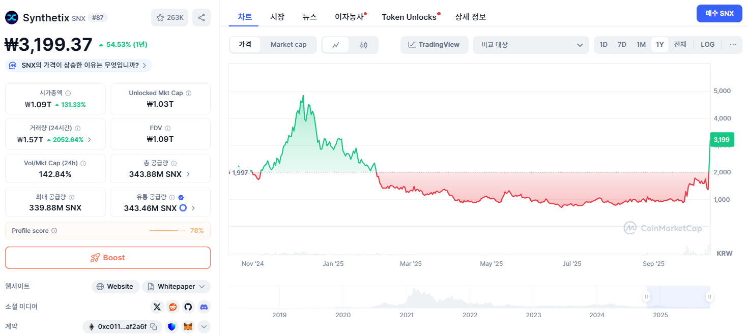 SNX는 지난 24시간 동안 130% 이상 급등해 현재 2.2달러 선에서 거래되고 있다. 일일 거래량은 16배(약 1,600%) 이상 증가한 9억 100만 달러를 넘어섰으며, 시가총액은 약 7억 7,800만 달러에 이르고 있다.