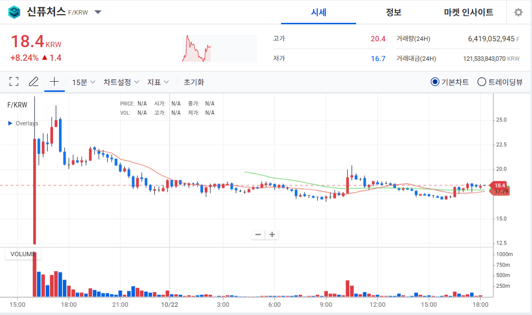 지난 21일 업비트 신규 상장한 신퓨처스(F)가 27.4원의 고가를 기록하고 현재 18원대에서 횡보세를 보이고 있다.