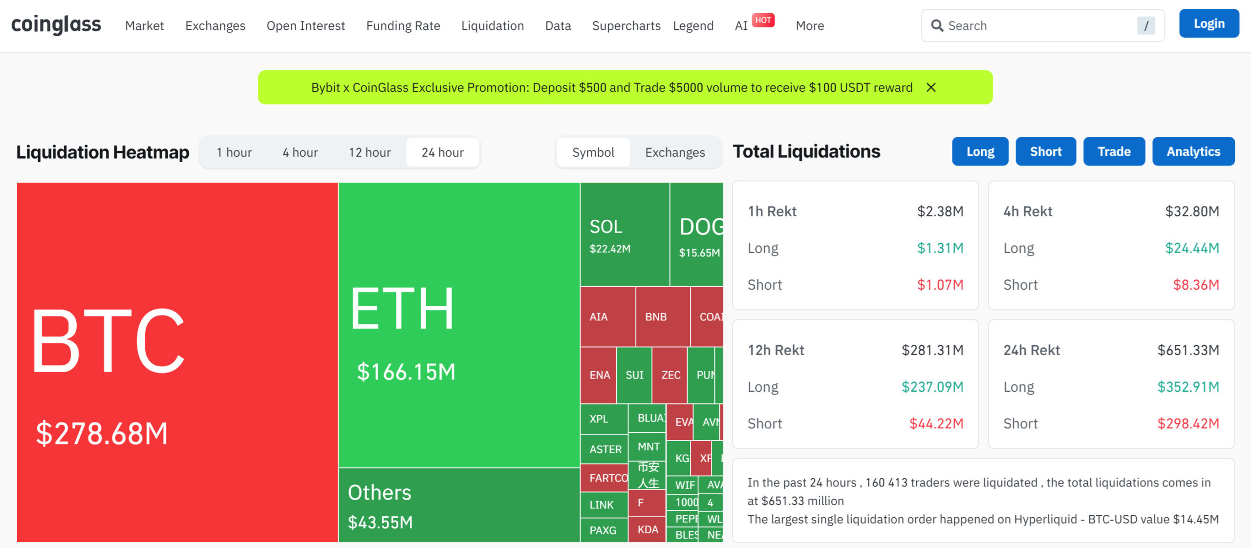 코인글래스(CoinGlass) 데이터에 따르면, 지난 24시간 동안 약 6억 5,000만 달러 규모의 레버리지 포지션이 청산되었으며, 이는 10월 초 이후 하루 기준 최대 규모의 청산으로 기록됐다.