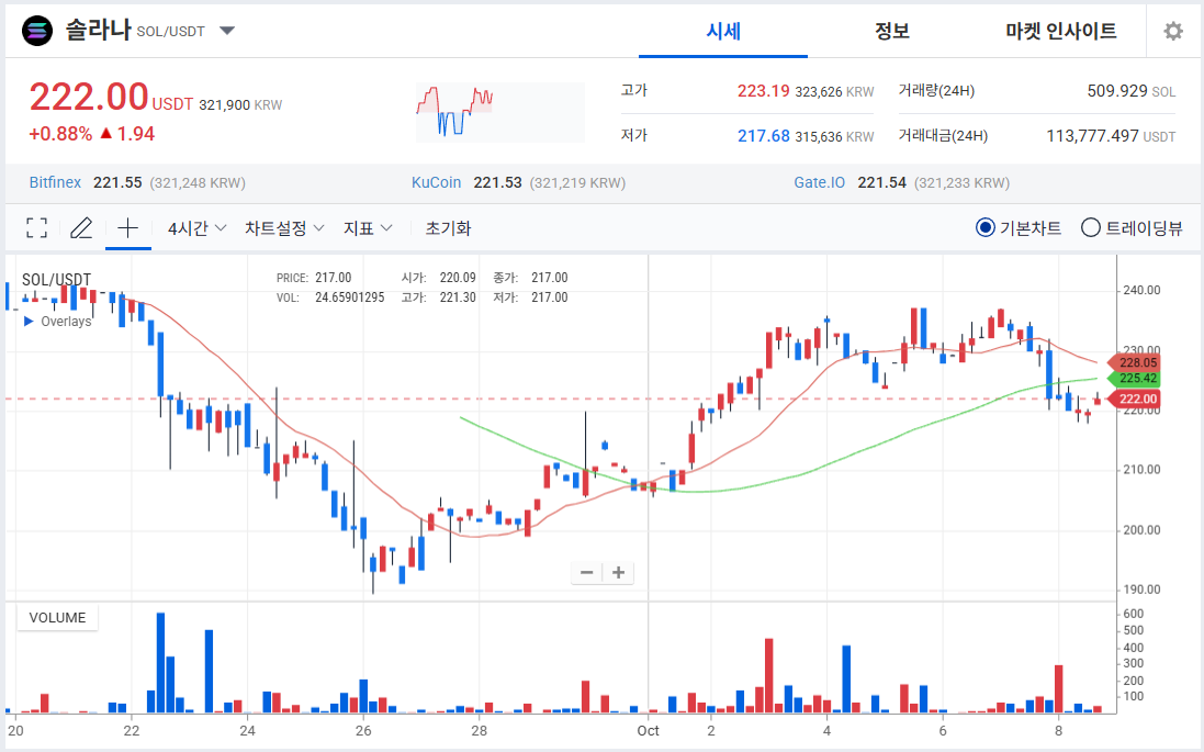 10월 8일, 솔라나(Solana)는 장중 6% 하락하며 218.40달러까지 떨어졌다. 이후 소폭 반등해 221.94달러를 기록했지만, 9월 고점 대비 약 12% 낮은 수준이다.