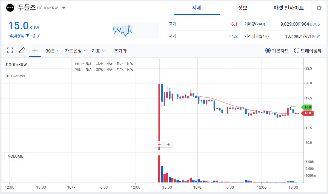 두들즈(DOOD)가 10월 7일 오후 업비트에 신규 상장되며 급등세를 보였다. 상장 직후 9원대에서 18원대로 뛰었고, 거래량도 빠르게 증가했다.