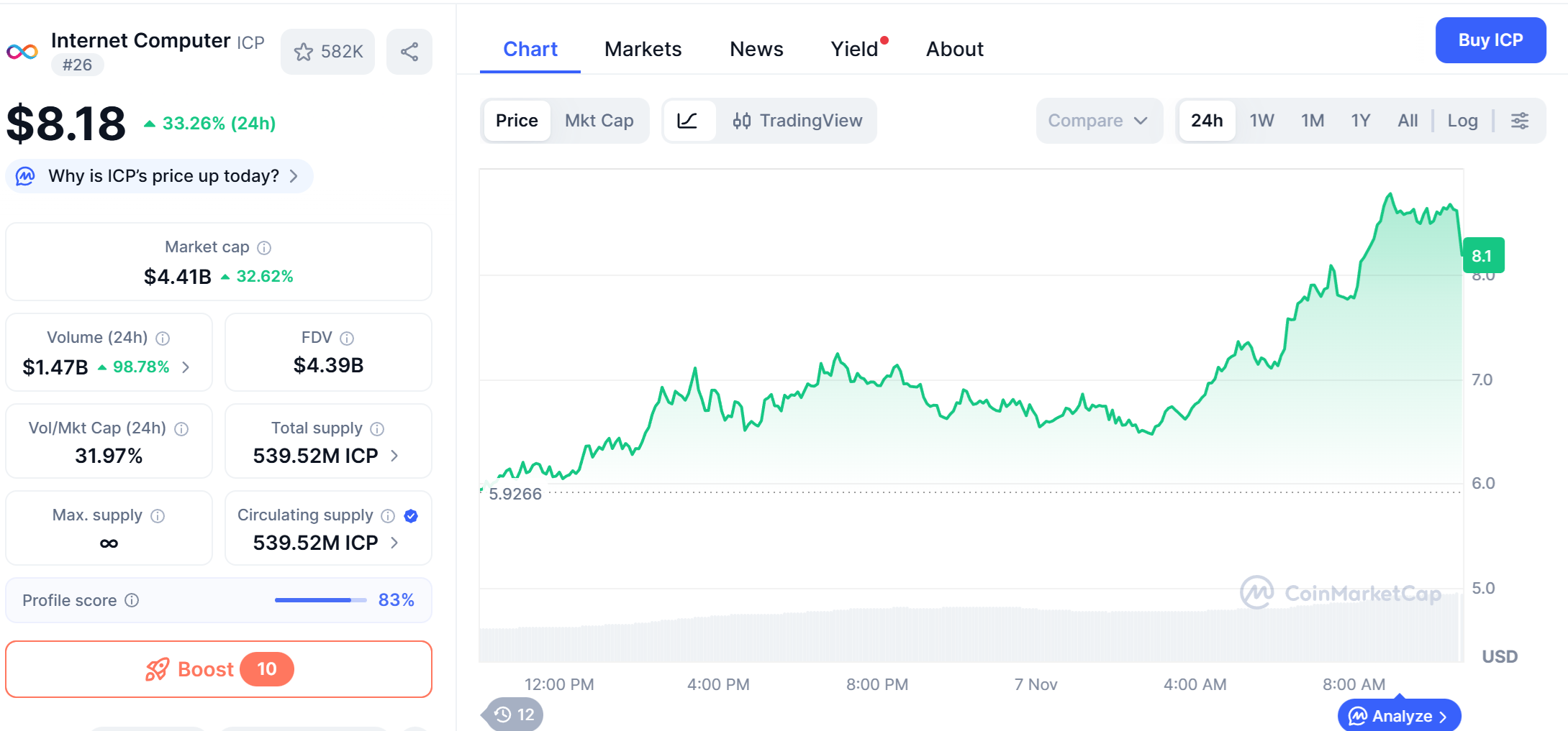 코인마켓캡(CoinMarketCap) 데이터에 따르면, 현재 ICP 가격은 8.18달러이며 시가총액은 44억 2,000만 달러로, 전체 암호화폐 가운데 상위 30위권에 진입했다.