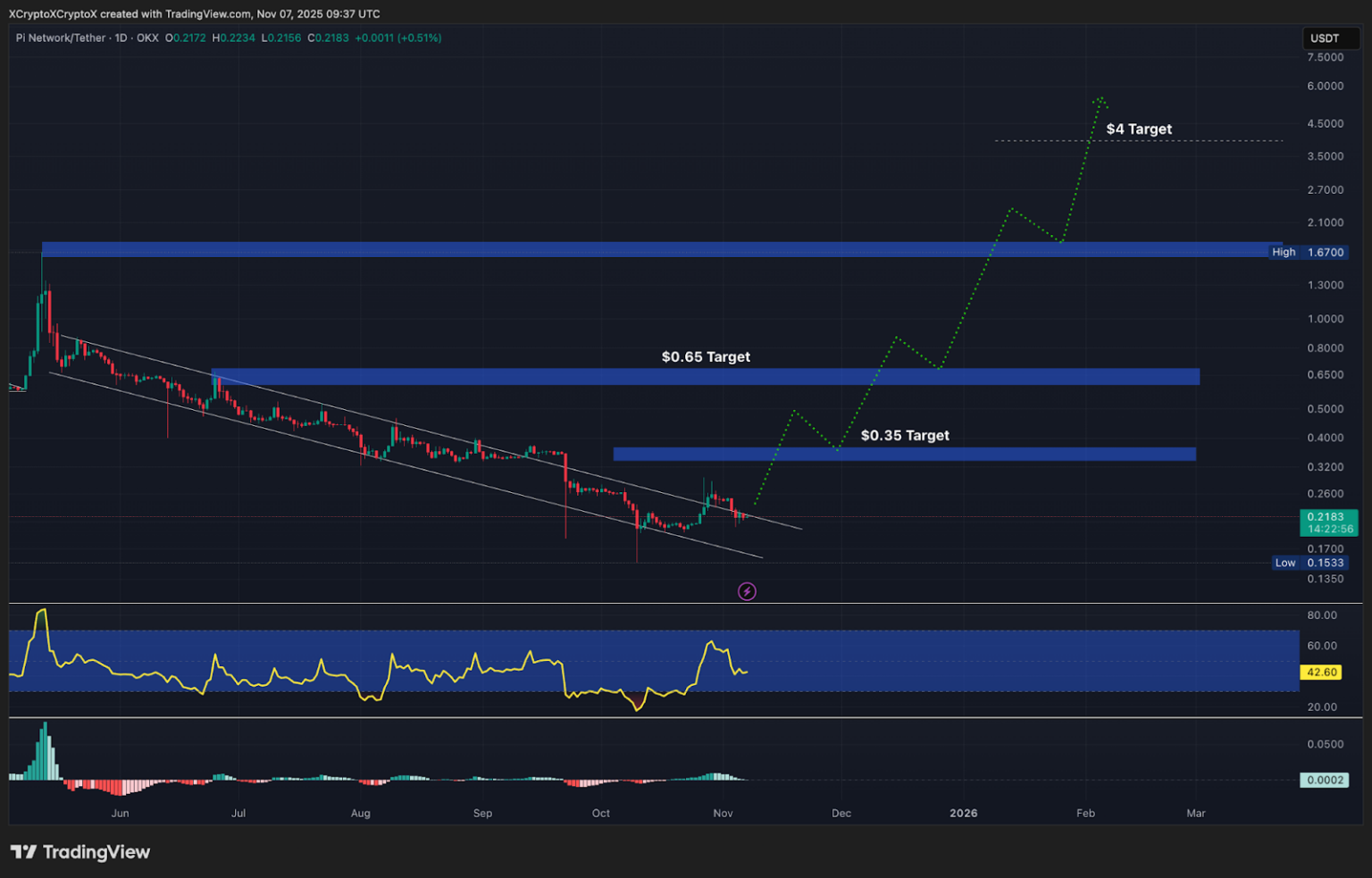 일간 차트에서는 파이코인 가격이 장기적인 하락 채널 패턴 내에서 거래되고 있다. 이는 일반적으로 추세 반전 신호로 해석된다.