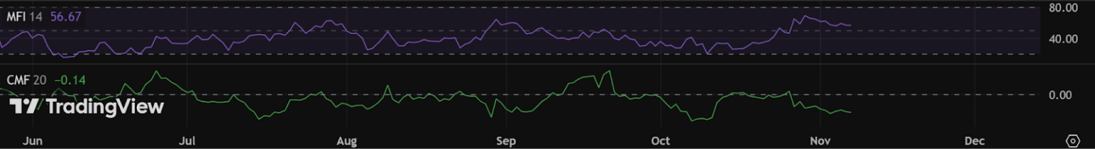 머니 플로우 지수(MFI: Money Flow Index)는 56.67로, 중립에서 강세로 이어지는 구간에 있다. 이는 시장이 과열되지 않고 완만한 매수세가 유입되고 있다는 것을 의미한다.