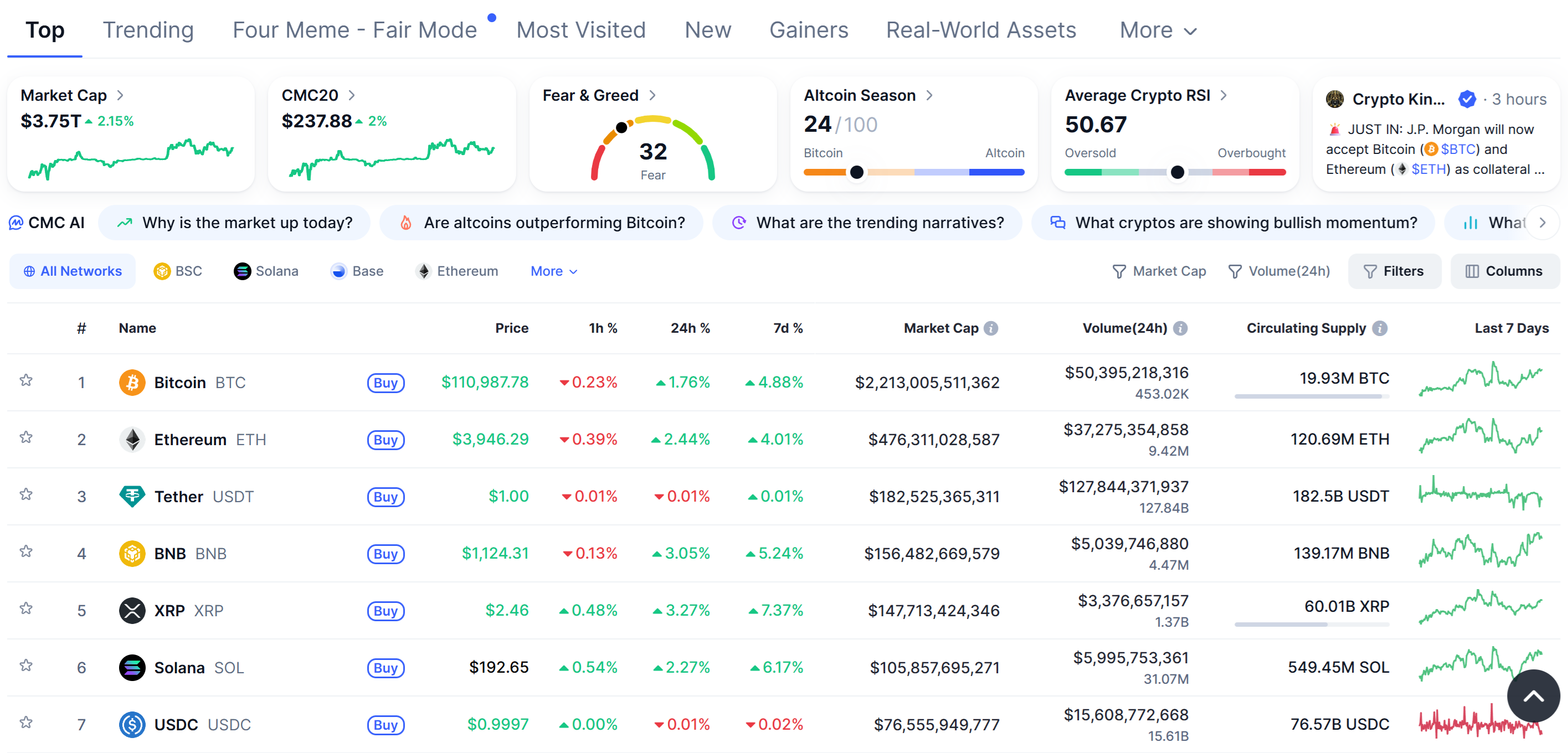 The crypto market is on the rise today, on Oct. 24. The total market capitalization has climbed 2.15% to reach $3.75 trillion. An impressive 95 of the top 100 cryptocurrencies have gained value in the past 24 hours.