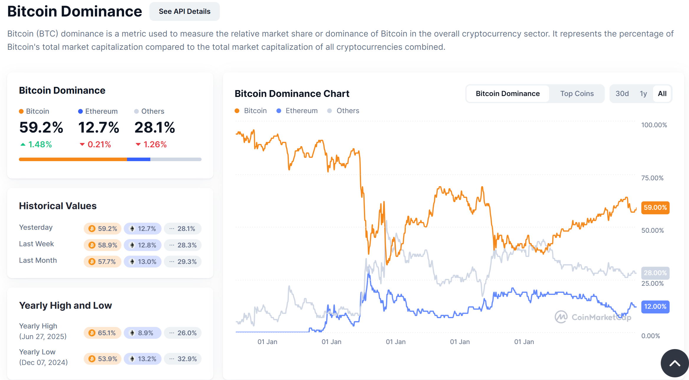 According to CoinMarketCap, Bitcoin’s market dominance has increased to 59.2%.