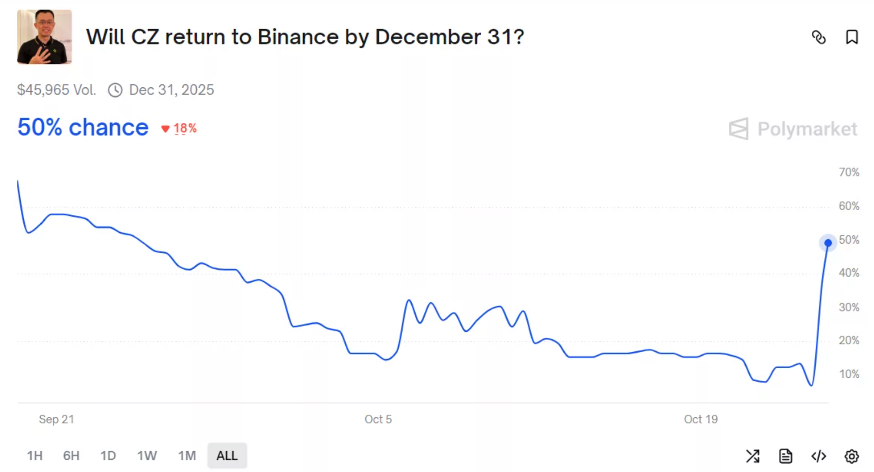 After Donald Trump pardoned CZ on Oct. 23, prediction markets reacted sharply. Now, traders are pricing in a 50% chance that Zhao will return to Binance by the end of 2025.