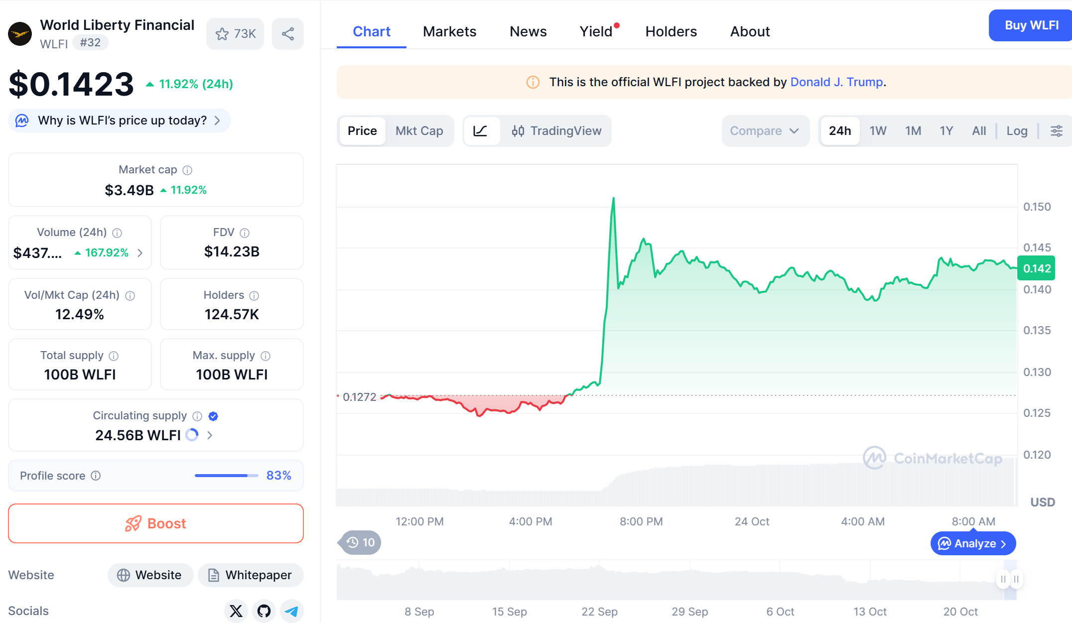 At the current moment, WLFI is up nearly 12%, trading at $0.1423.