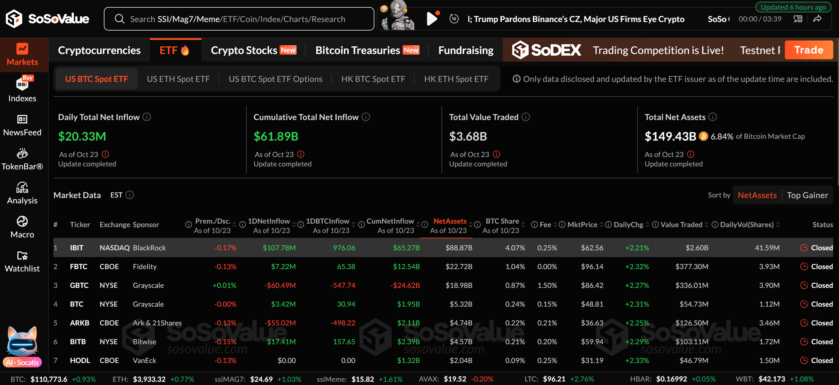 Bitcoin ETFs managed to rebound from the previous day’s outflows amid shifting investor sentiment and saw $20.3 million in inflows on Oct. 23. BlackRock’s IBIT led the recovery with $107.8 million in new inflows.