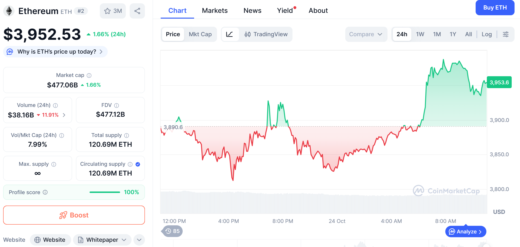 Ethereum (ETH) was trading at $3,952, marking a 1.7% gain over the past 24 hours. Over the past week, the asset has ranged between $3,709 and $4,080. ETH currently sits 19% below its all-time high of $4,956, recorded on Aug. 24.