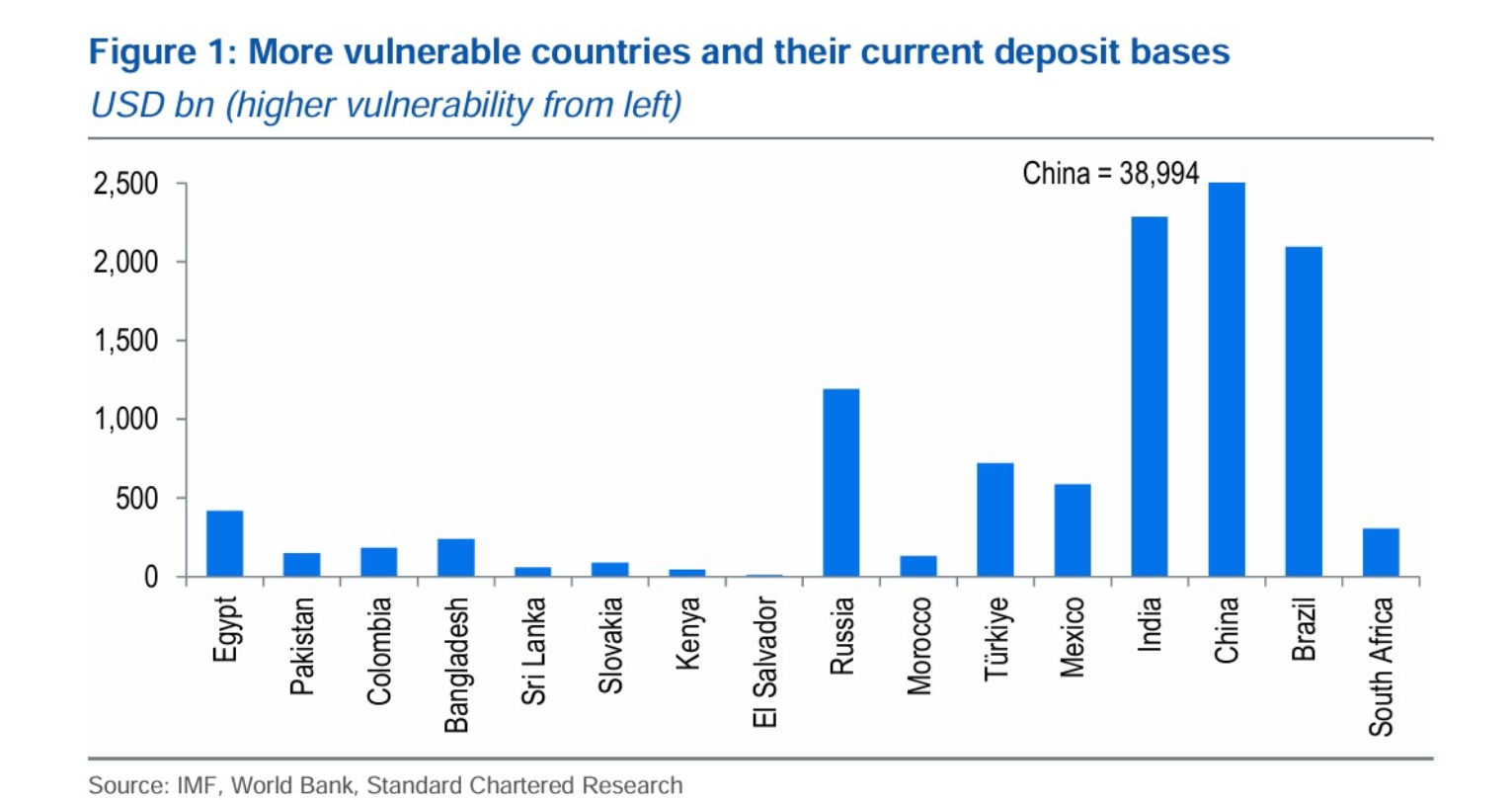 Standard Chartered estimates that stablecoin holdings used for savings in emerging markets (EMs) could surge from $173 billion today to $1.22 trillion by 2028. Meanwhile, roughly $1 trillion may exit EM banking systems within the next three years as users pivot toward digitally native dollar alternatives.