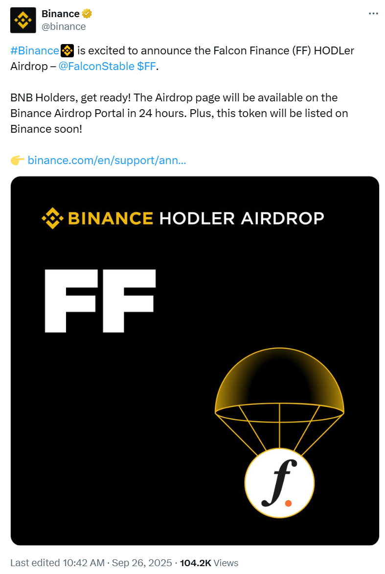 Following the airdrop, Binance plans to list Falcon Finance for trading on Sept. 29 at 13:00 UTC.