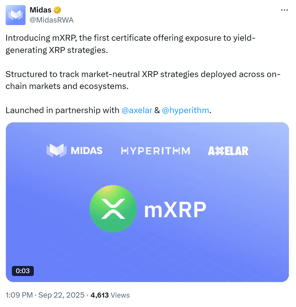 Midas has introduced mXRP, a tokenized version of XRP built on the XRP Ledger’s EVM sidechain. Axelar provides the infrastructure and cross-chain interoperability.