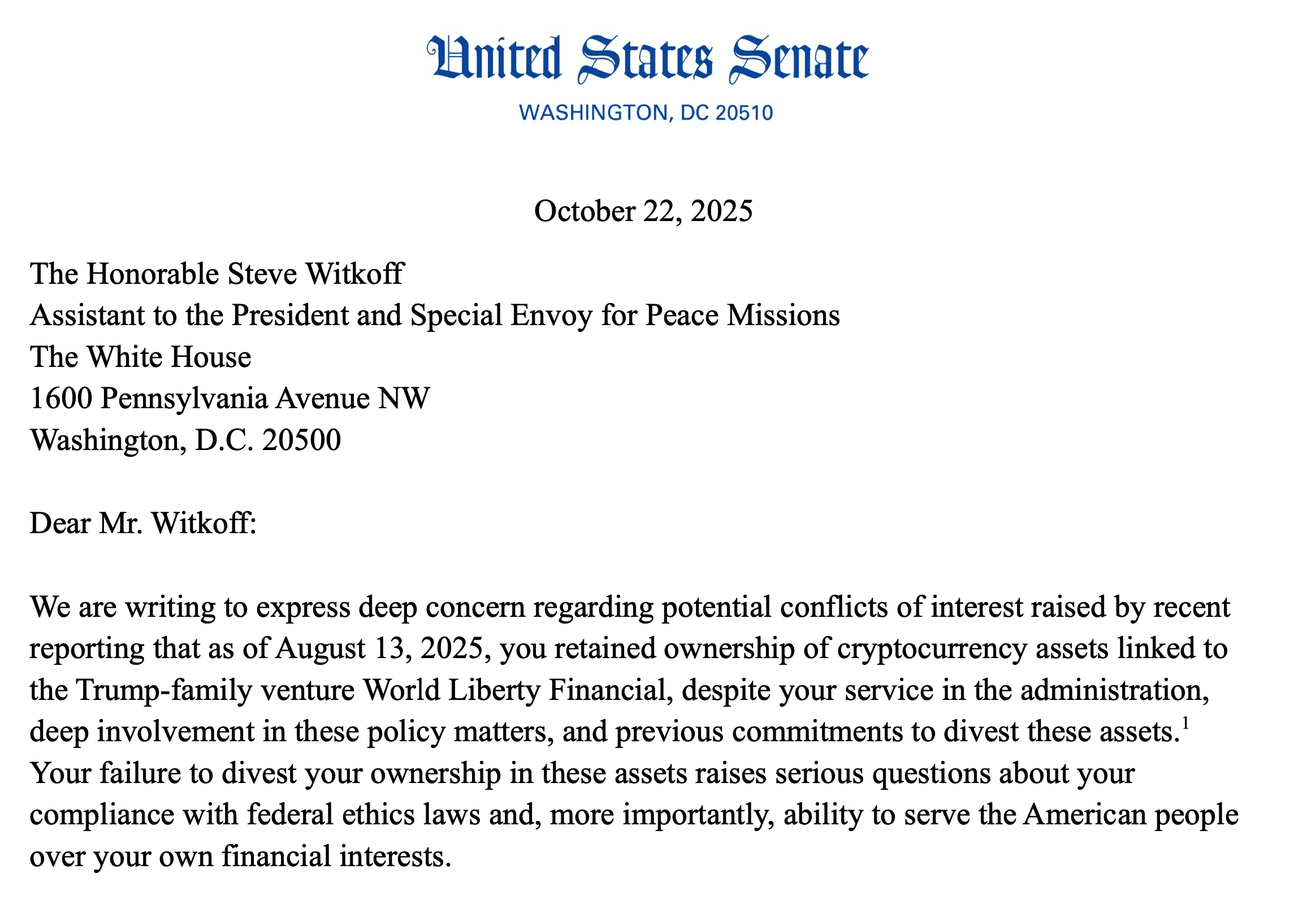 Senate Democrats are questioning President Trump’s growing involvement in cryptocurrency, citing possible conflicts of interest tied to his envoy Steve Witkoff and Trump-linked firm World Liberty Financial.