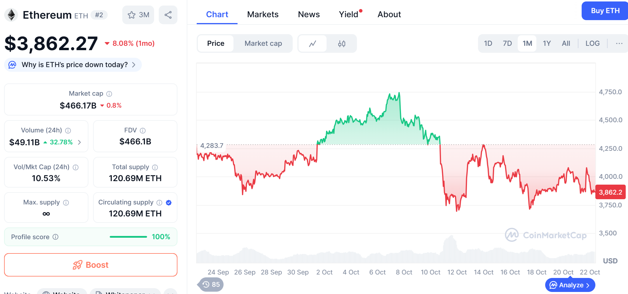 Ethereum (ETH) is currently trading at $3,862, down 0.84% over the past 24 hours. Over the last week, the token has fluctuated between $3,709 and $4,183. Despite recent volatility, Ethereum remains 21% below its August peak of $4,946.