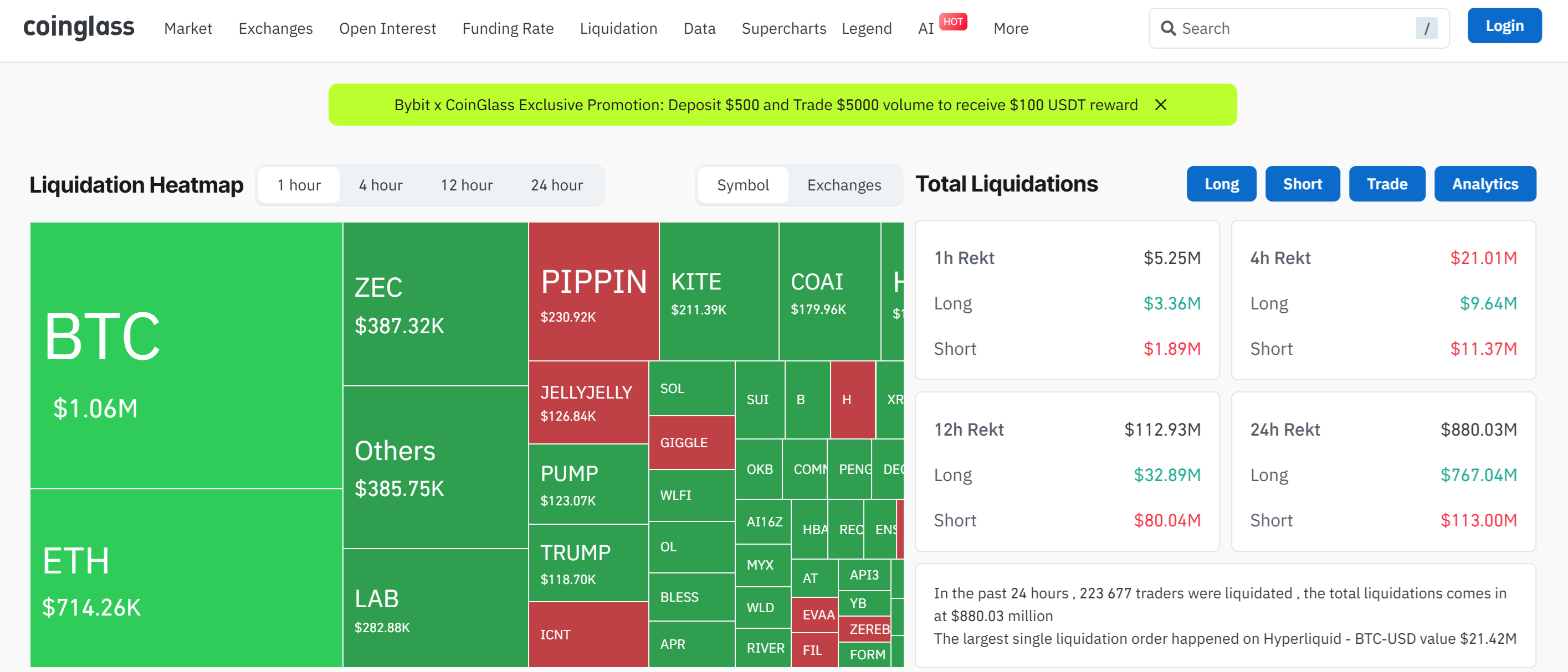 Over the past 24 hours, the crypto market saw a massive $880 million liquidation in leveraged positions. Long positions made up the majority of the wipeout, totaling $767 million, compared to $112.99 million in shorts.